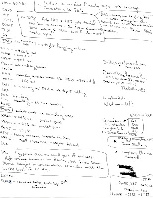 However, after a big down day one would be expecting to see a small range consolidation day, but this may not be the case either as Egypt hasn't resolved anything this weekend. A few of my friends that trade the /ES are expecting consolidation monday, small up day tuesday, and then selling to resume on wednesday. Only the market knows for sure which path it's gonna take, but enough retail money came into the market in January that a pullback / shakeout is in order.